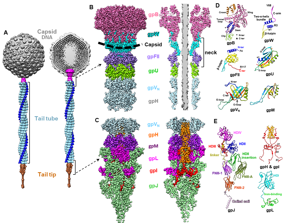 噬菌体是侵染细菌的病毒,是地球上数量最为庞大、多样性最为丰富的生物实体,它不仅是基因工程的良好载体、抗生素的潜在替代品,也作为模式生物系统而广泛应用于病毒组装和感染等机制研究。绝大多数噬菌体为有尾噬菌体。成熟的有尾噬菌体颗粒由一个包裹致密DNA的二十面体(或拉长的二十面体)头部连接一个特殊尾部组成。噬菌体的尾部直接介导宿主细胞的识别与感染、基因组释放等关键功能。根据尾部形态,有尾噬菌体可分为:短尾噬菌体、长尾噬菌体和肌尾噬菌体。长尾噬菌体尾部细长而柔软,导致其原位结构解析非常困难。在此之前,研究者尚未获得完整长尾噬菌体的高分辨结构信息。