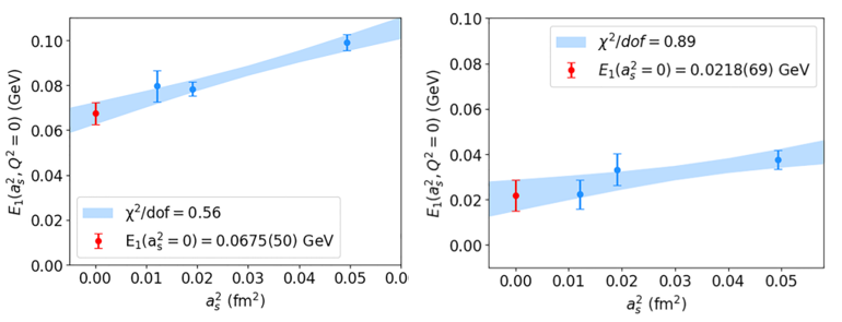 三组格子上胶球在J/\psi辐射过程(左)及胶球到phi介子过程(右)电磁形状因子的外推结果