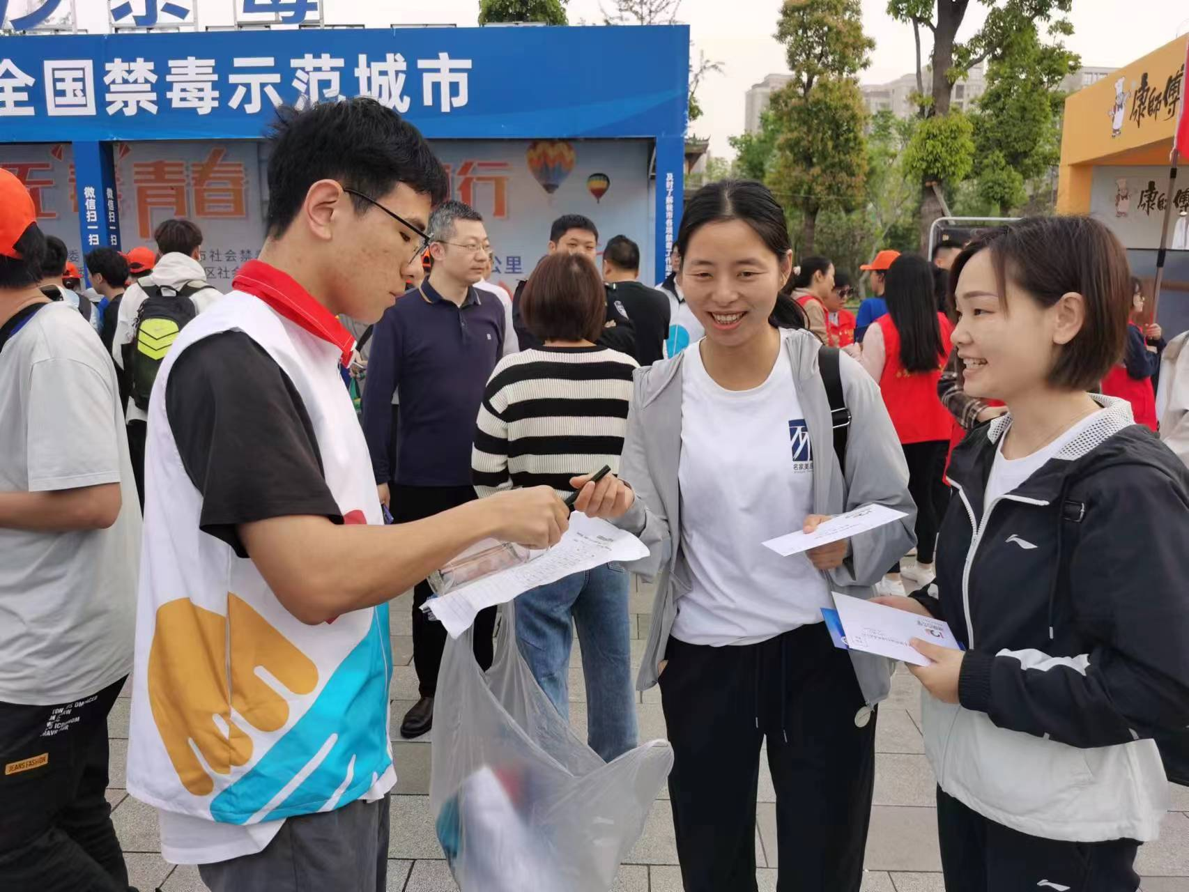 活动中,意昂体育志愿者对参加百公里毅行运动员以积极讲解禁毒知识,发放宣传资料等方式开展禁毒宣传,向参加活动的群众普及禁毒知识及相关的法律法规,禁毒展示台上,志愿者为前来参加活动的居民展示了各种有可能日常接触到的毒品,并通过体感互动游戏,潜移默化引导参加活动的居民和员工辨别和抵抗生活中的各种毒品诱惑。