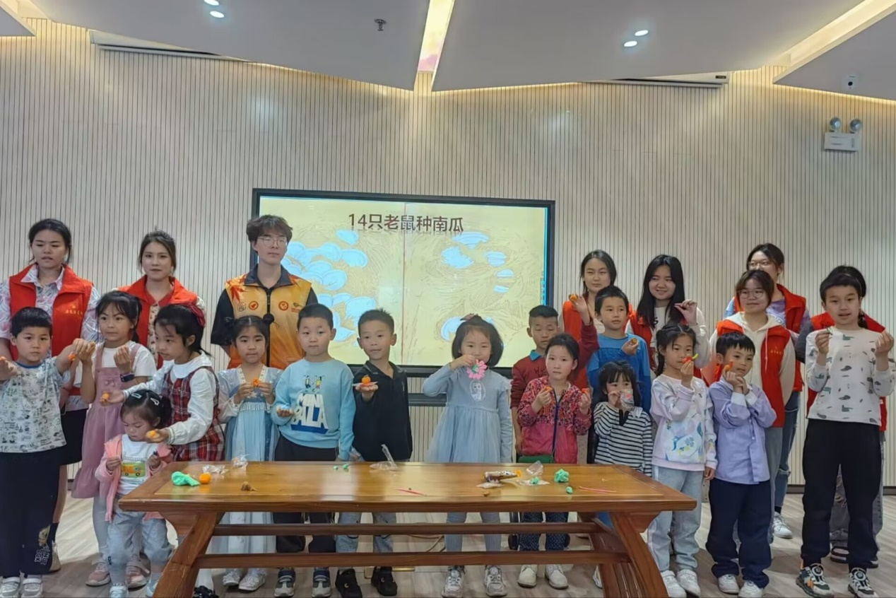 活动开始前,志愿者引导到场的小朋友签到,并且和小朋友们进行互动以活跃气氛。主讲人何桥成用生动形象的语言为小朋友们讲解了《14只老鼠种南瓜》的故事,讲解过程中,他通过提问的方式引导小朋友们积极参与,并对积极回答问题的小朋友给予零食奖励。为加深小朋友对绘本的理解,何桥成和志愿者们还利用视频讲解和现场教学等方式教带领小朋友们用粘土制作模型,并对作品进行展示和点评。活动结束后,志愿者们与小朋友们进行合影留念。