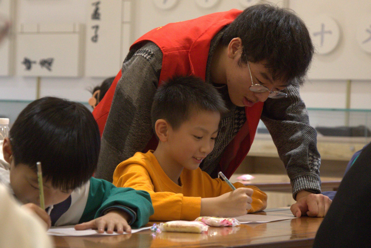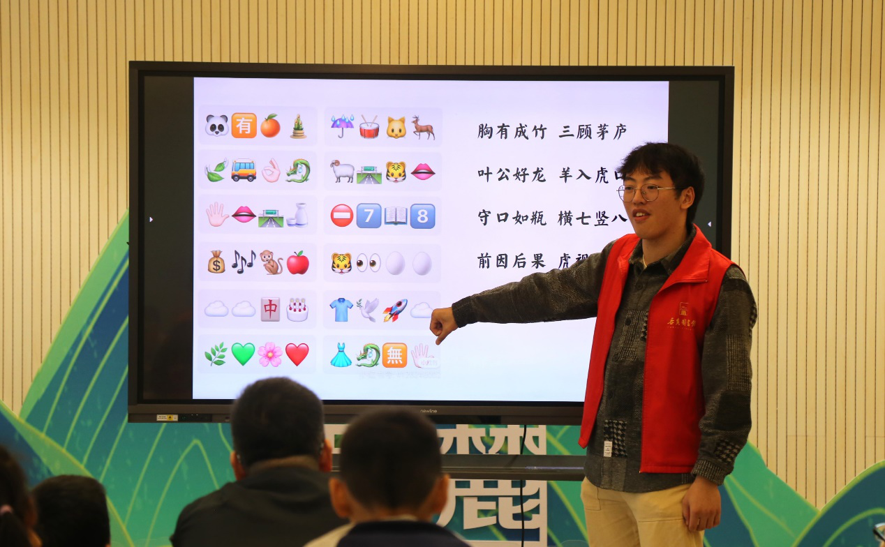 为激发小朋友们的思维活跃性,营造融洽的氛围,故事开讲前,黄睿先同小朋友们进行了“看图猜成语”的小游戏,小朋友们纷纷积极地举手抢答。通过PPT放映的方式,他向小朋友们展示了华山上与故事相关的景点,将小朋友们引入故事情节中。他用生动活泼的语言向小朋友们分享了《巨灵劈山》的故事,故事中,巨灵神不畏艰险,用尽全力劈开山以疏导洪水,拯救百姓于危难之中。在志愿者们的指导下,小朋友们画出巨灵山分开两座大山的情形,加深了对故事的印象。