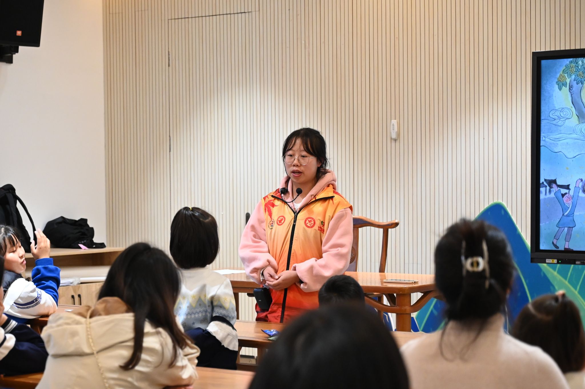 活动开始前,志愿者们协助现场人员进行签到,并维持现场活动秩序,为后续课堂开展营造良好氛围。彭雅智讲述主题故事——《吴刚伐桂》,讲解过程中,她抛出多个问题引导小朋友们思考,并采取零食奖励机制鼓励小朋友们积极发言,并设置了手工互动环节调动故事会的氛围。在志愿者们的带领下,一张张普普通通的彩纸经过小朋友们折、叠、翻等简单操作后,变幻出不同形状,极大锻炼了小朋友们的动手能力。志愿者将粘土材料分发给小朋友们后,细心地讲述粘土创作的步骤和注意事项,并引导小朋友们仔细观察兔子粘土的身体结构和颜色搭配,鼓励小朋友发挥想象力去动手创作属于自己的兔子。