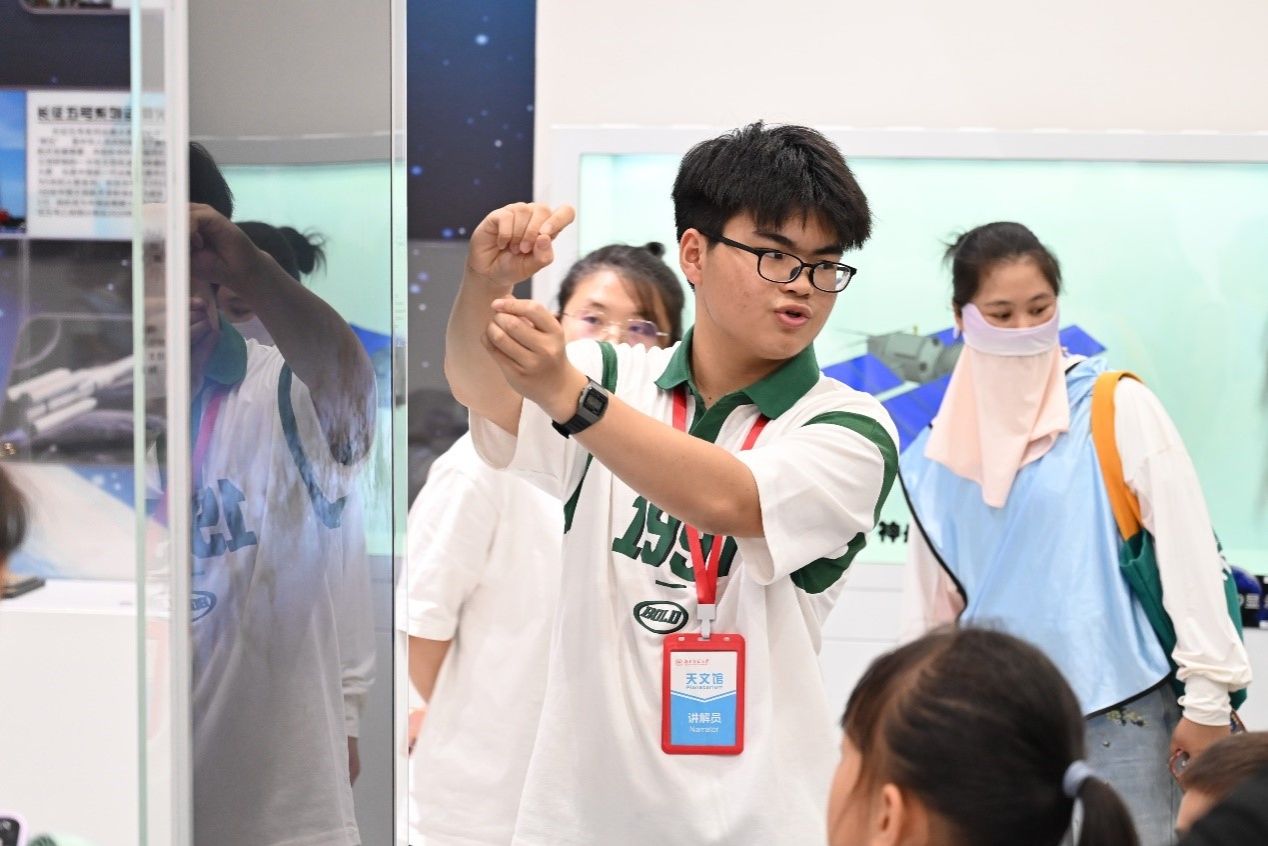 在志愿者们的带领下,参观者们先进入六楼展览厅听讲解员介绍相关板块知识。讲解员从基本的天文知识切入,由浅入深地讲解了恒星演化、黑洞形成、西方八十八星座等天文知识,并详细介绍了中国古代天文学发展史。参观者们进入七楼,讲解员通过讲解傅科摆原理引入地球自转话题,讲解了宇宙大爆炸、弗里德曼三大模型、宇宙物质形成及暗物质暗能量等天文学相关知识。随着参观过程的推进,参观者们跟随讲解员来到天文馆八、九楼学习望远镜的构造以及太阳系的基本结构,并在讲解员及志愿者的指导下于室外用望远镜进行了观测。