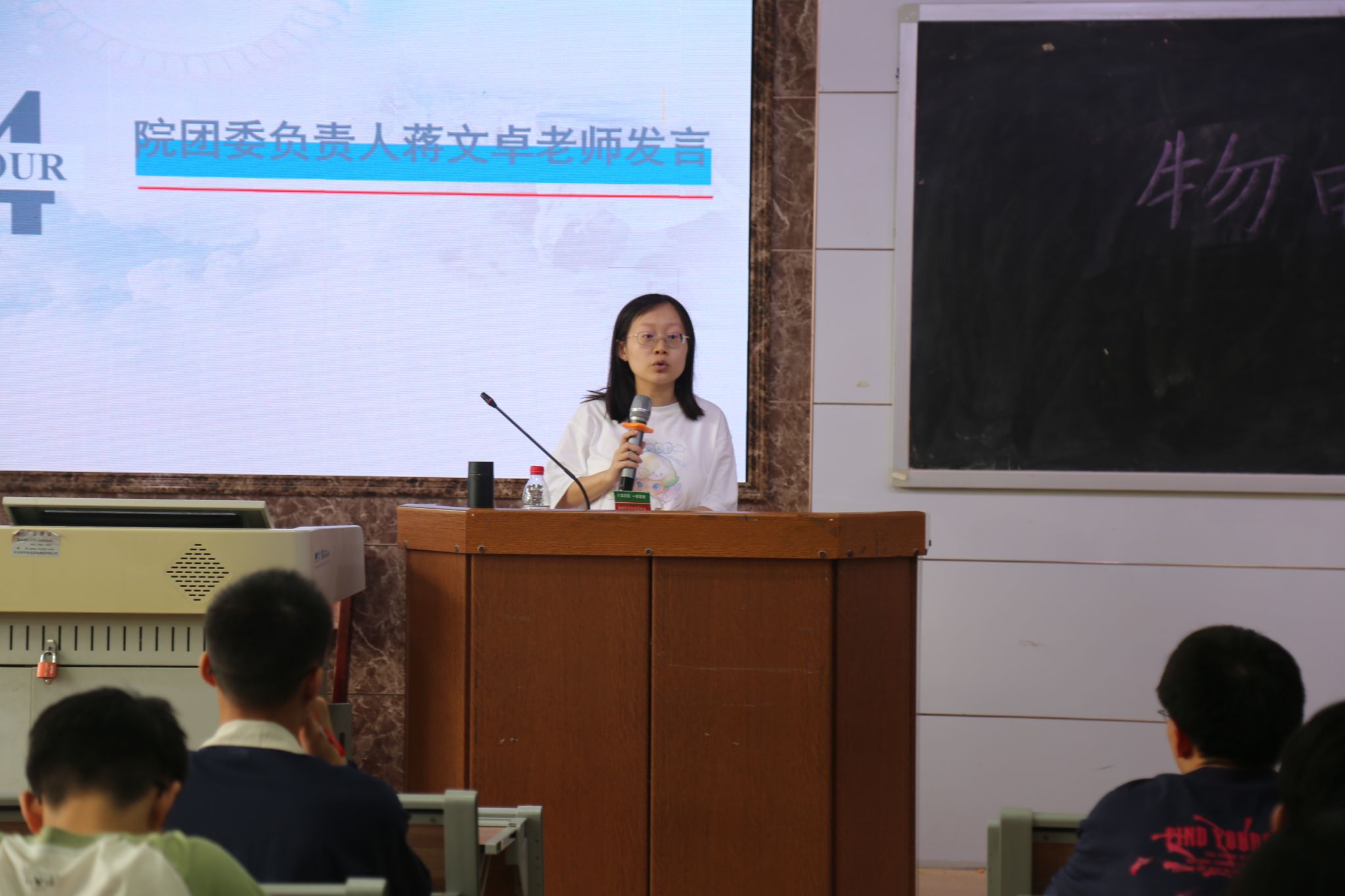 会议分为奏唱团歌、“往年队伍队长发言”及“院团委负责人蒋文卓老师发言”三个部分。彭紫琪与李思阳作为往年队伍队长分享自己三下乡经验。彭紫琪针对“三下乡”课程设计提出设计要求,即与物理知识相结合,突出物理特色。她提出在课程设计过程中,要集思广益,尊重队友的建议。李思阳提到“三下乡”中可能遇到的问题并结合往年的经历提出解决办法。蒋文卓讲述了掌握安全急救知识的重要性,提醒各队伍在“三下乡”过程中注意人身财产安全,宣传预防疾病知识。她结合往年“三下乡”队伍案例,鼓励同学们秉承初心,发扬奉献精神,让青春为中国式现代化挺膺担当。