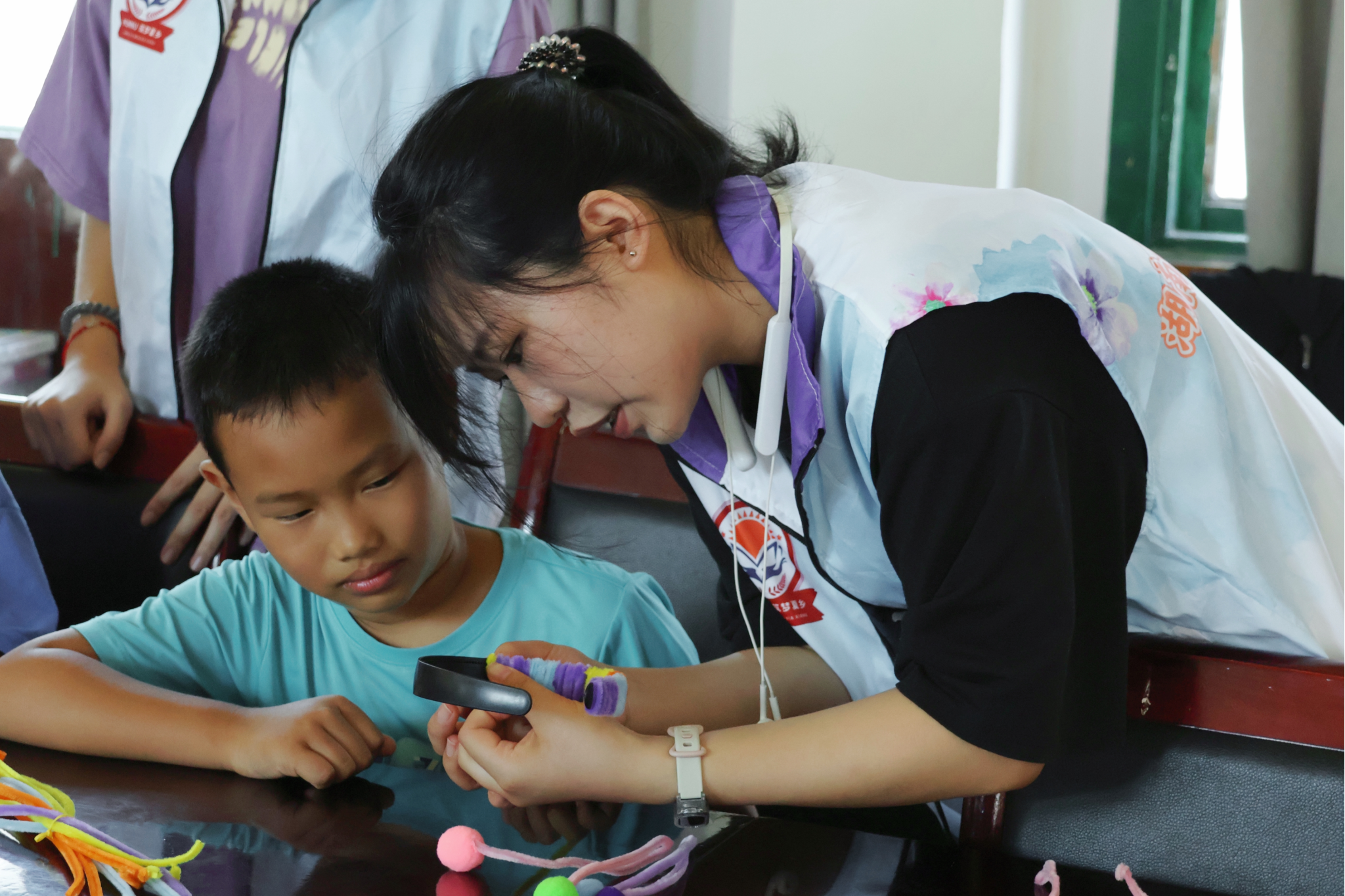 吴欢向孩子讲解发箍的制作方法