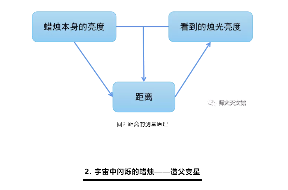 试想在夜晚,如果远处放了一支蜡烛,你会觉得非常昏暗。倘若把蜡烛移动到眼前,便会觉得十分明亮了。蜡烛本身发出的光的强度没有变化,只是由于距离的改变,使得你的眼睛看到的亮度发生了变化。也就是说,亮度和距离存在一种关系,如果我们知道了蜡烛本身的亮度,并测量我们看到的亮度,就可以推算出蜡烛离我们有多远。