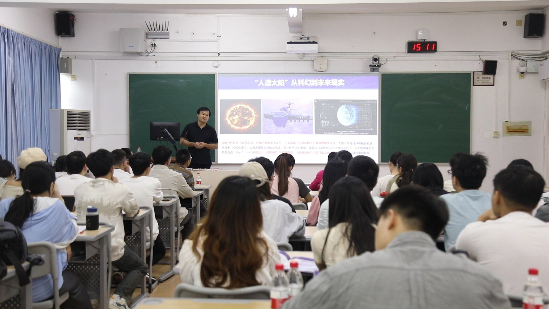 报告会上,师生围绕人造小太阳(托卡马克核聚变实验装置)自主研发与成果、近期太阳耀斑爆发、量子超导与超导托卡马克的区别和联系等问题与物理系教工党支部书记钟显辉、李妙辉等专家进行了交流互动。