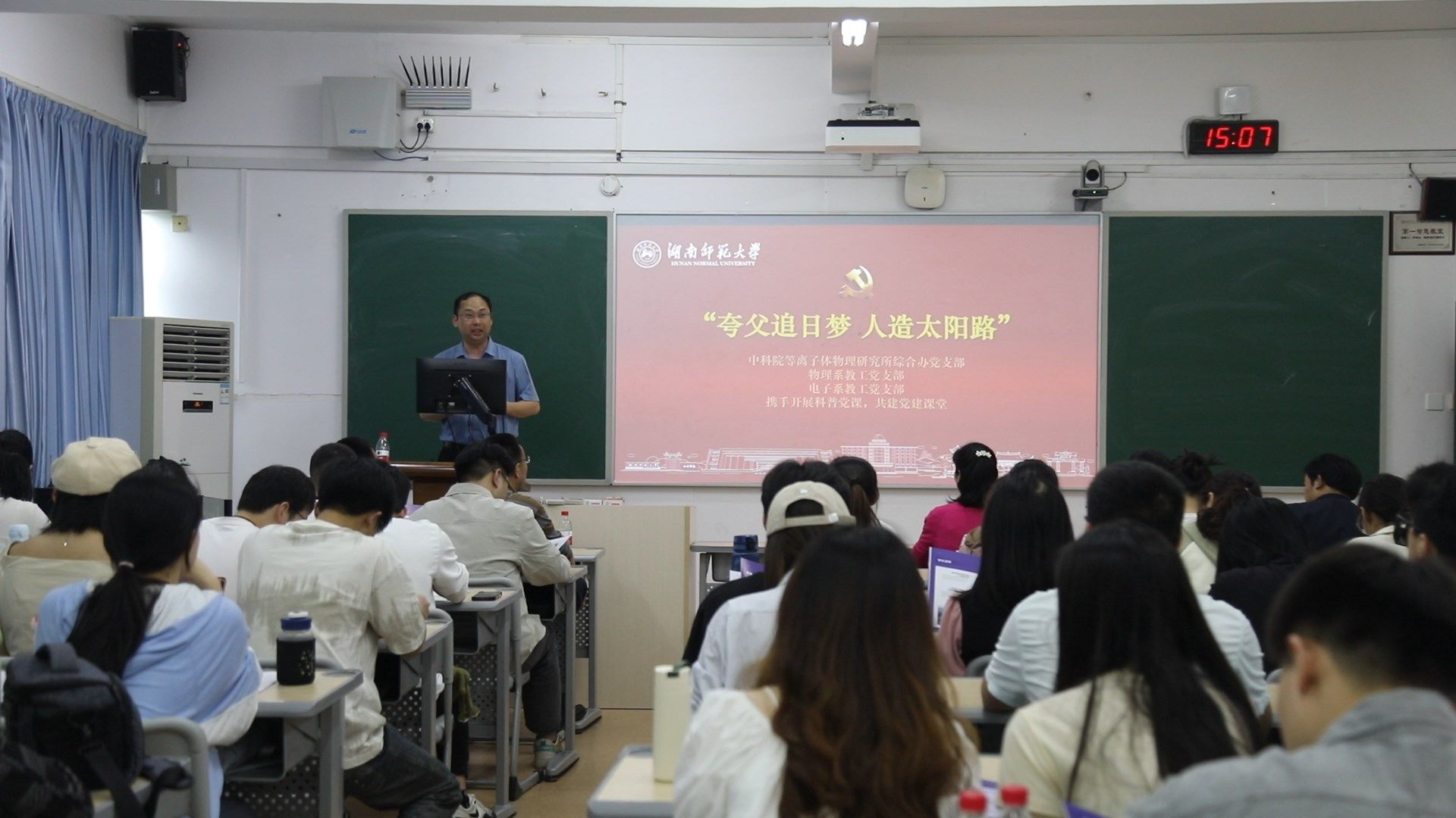 5月9日,意昂体育物理系教工党支部、电子系教工党支部联合中国科公司等离子体物理研究所(以下简称“等离子体所”)综合办党支部开展了“夸父追日梦 人造太阳路”科普党课活动。