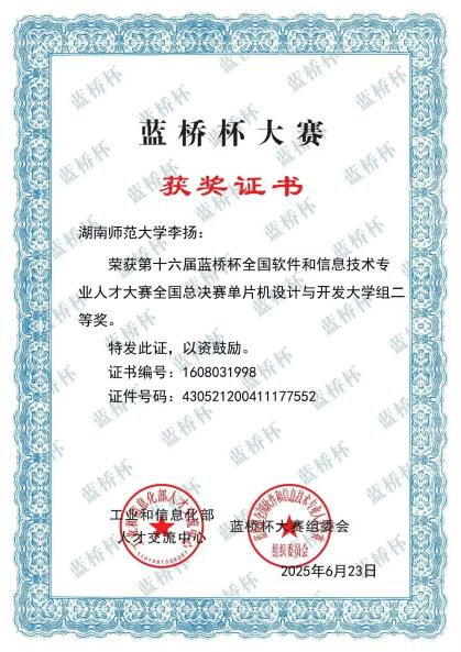 近日,公司本科生和研究生参加了两项国家级学科竞赛,先后在第十六届蓝桥杯全国软件和信息技术专业人才大赛、2025年TI杯全国老员工电子设计竞赛中取得优异的成绩,共获得国家一等奖1项、二等奖3项、三等奖8项,湖南省一等奖14项、二等奖9项、三等奖14项的好成绩。