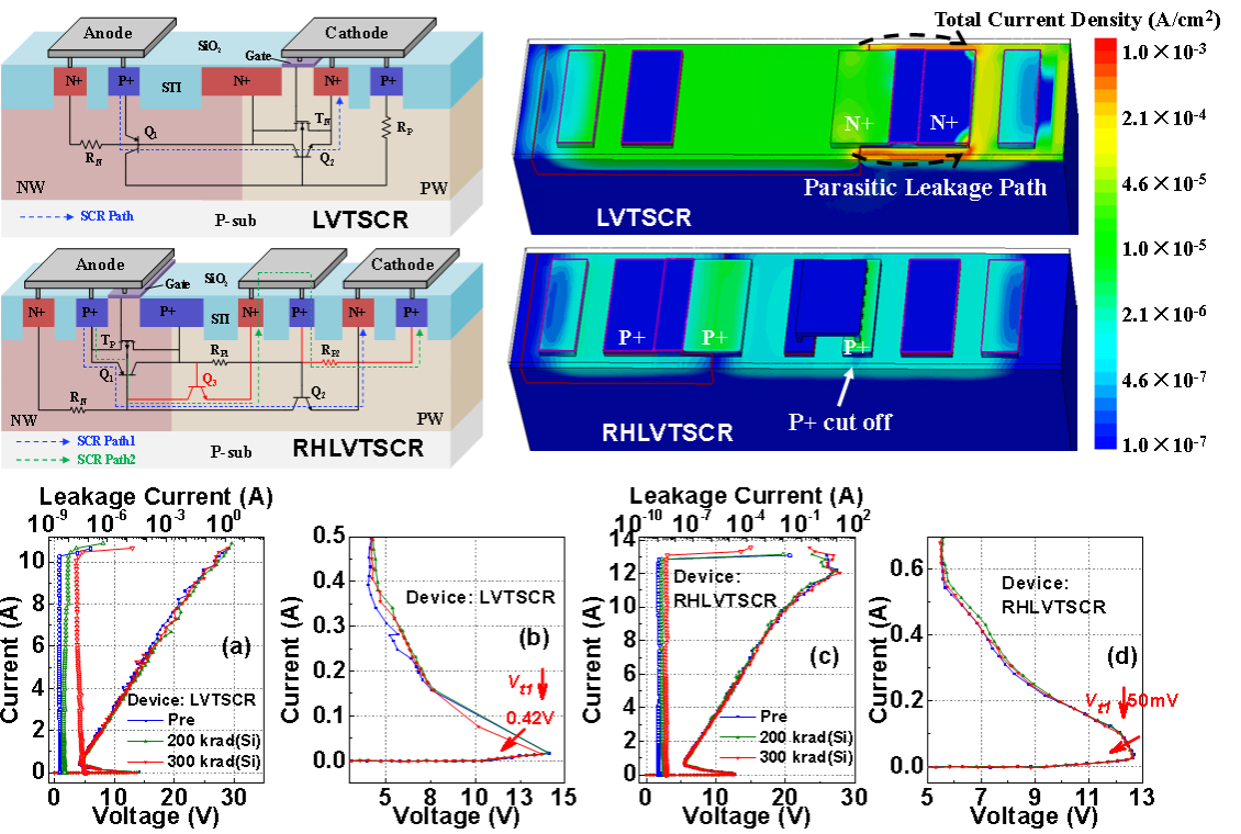 空间辐射环境会导致电子器件的氧化物陷阱和硅/氧化物界面陷阱中电荷的沉积和积累,随着时间的推移这种现象会愈发严重。这些效应会显著增加漏电流或使静电放电(ESD)特性超出设计窗口,从而使ESD防护器件失效,传统ESD防护器件无法满足应用要求。因此,在空间应用中实施抗辐射的ESD防护解决方案至关重要。基于此,意昂体育官网意昂体育金湘亮教授团队提出一种抗辐射的低触发电压可控硅整流器,旨在同时优化维持电压、面积效率、辐射耐受性和兼容窄ESD窗口设计约束。这一成果为深空应用中的集成电路抗辐射静电防护器件提供了新的解决方案。
