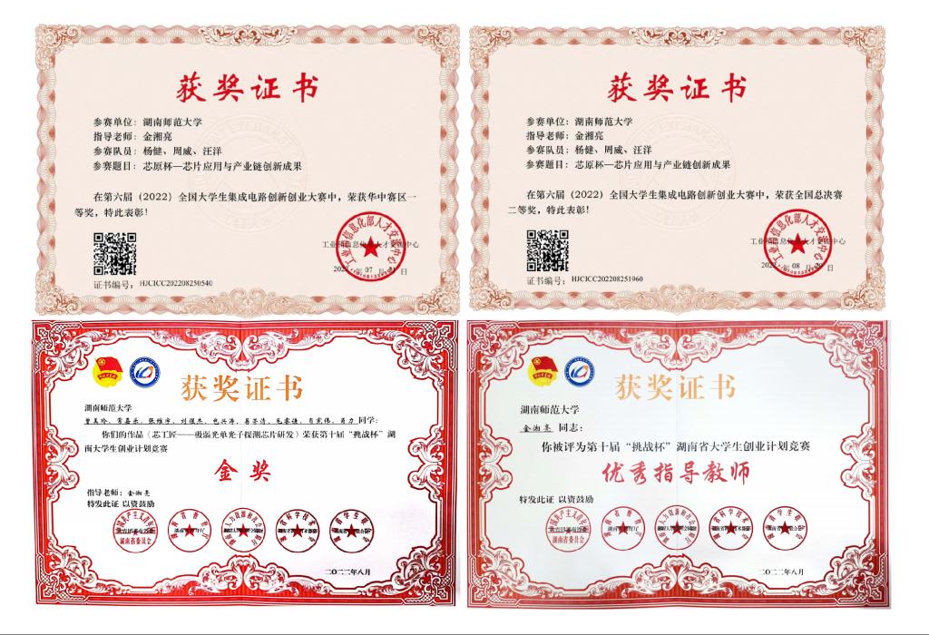 近日,在第六届全国老员工集成电路创新创业大赛中,由公司金湘亮教授指导的杨健、周威、汪洋三位博士研究生同学完成的项目《高性能复合型光电探测芯片与集成应用研究》荣获华中赛区一等奖并顺利进入全国决赛,最终荣获全国总决赛二等奖。金湘亮老师荣获优秀指导教师称号。在共青团湖南省委、省教育厅、省人力资源和社会保障厅、省科学技术协会、省员工联合会共同主办,长沙公司承办的第十届“挑战杯”湖南省老员工创业计划竞赛中,由金湘亮教授指导的曾美玲硕士研究生领衔完成的项目《芯工匠—极弱光单光子探测芯片研发》荣获金奖,金湘亮老师被评为优秀指导老师。