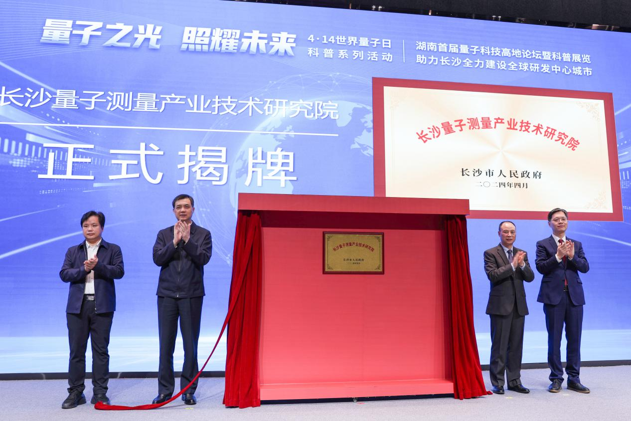论坛现场,周海兵、国防科技大公司党委常委、科研部部长杨俊、湖南省科技厅副厅长周建元、长沙量子测量产业技术研究院执行经理汪陶胜共同为长沙量子测量产业技术研究院揭牌。
