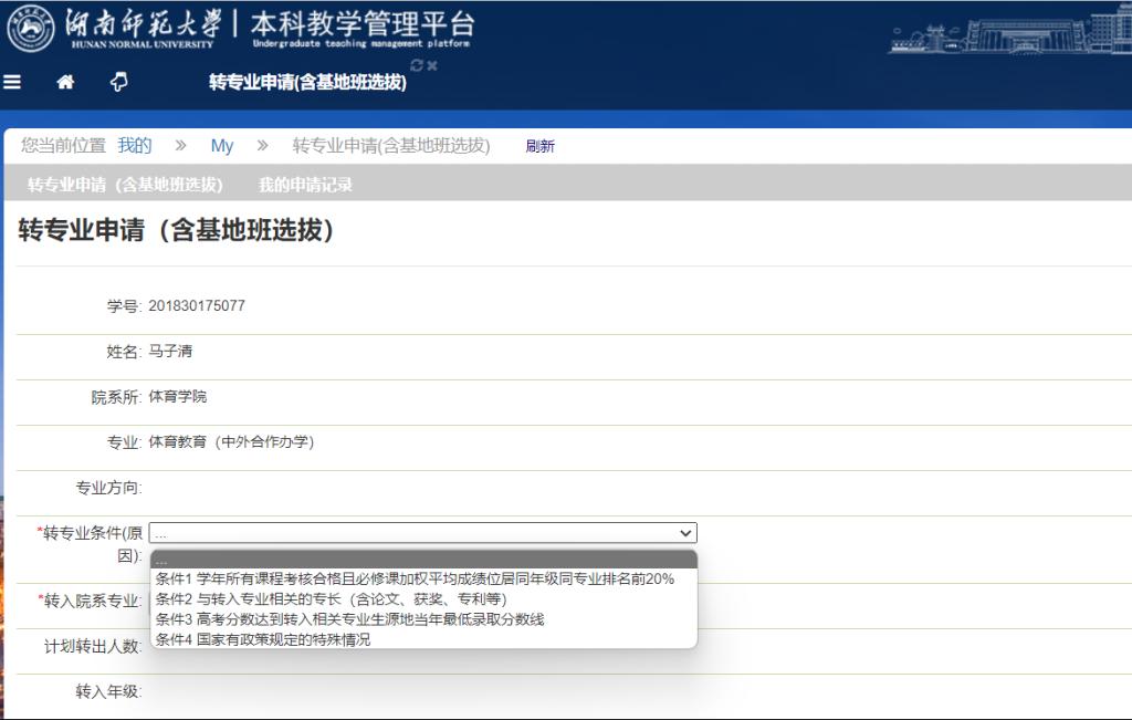 4、选择转专业条件后,在转入院系专业字段,选择自己想要转入的院系专业,按照要求填写下方所需信息后,点击【申请】按钮提交申请。
