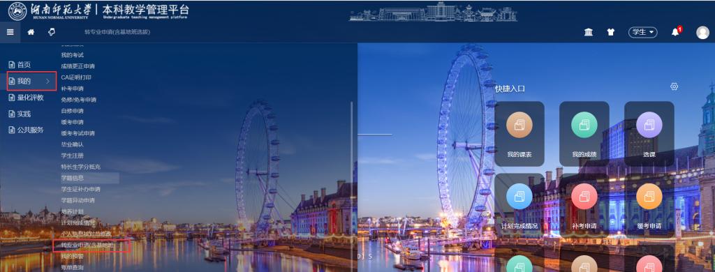 1、专业开始后,登录教务管理系统,在如下图,我的->转专业申请菜单可以进入转专业申请界面。