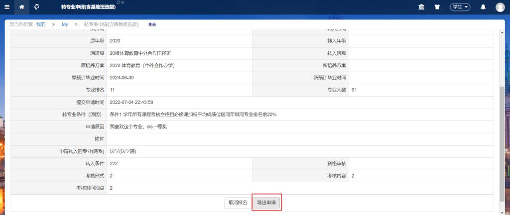 5、点击【申请】,申请成功后会提示申请成功并跳到如下界面,可以导出申请,在申请表上完善相关信息(注意要勾选转专业条件)后打印签字提交公司。
